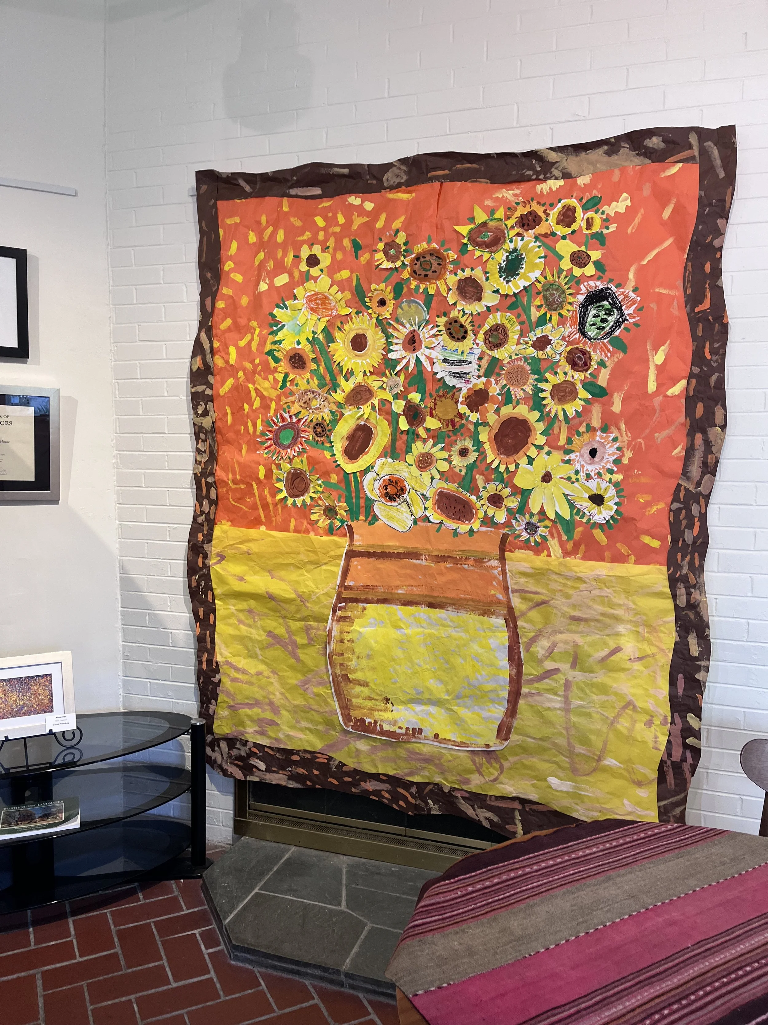 Current collaborations include Colonial Hills Elementary’s large first-grade sunflower mural—9 feet tall and 5 feet wide—recently exhibited at HRG.