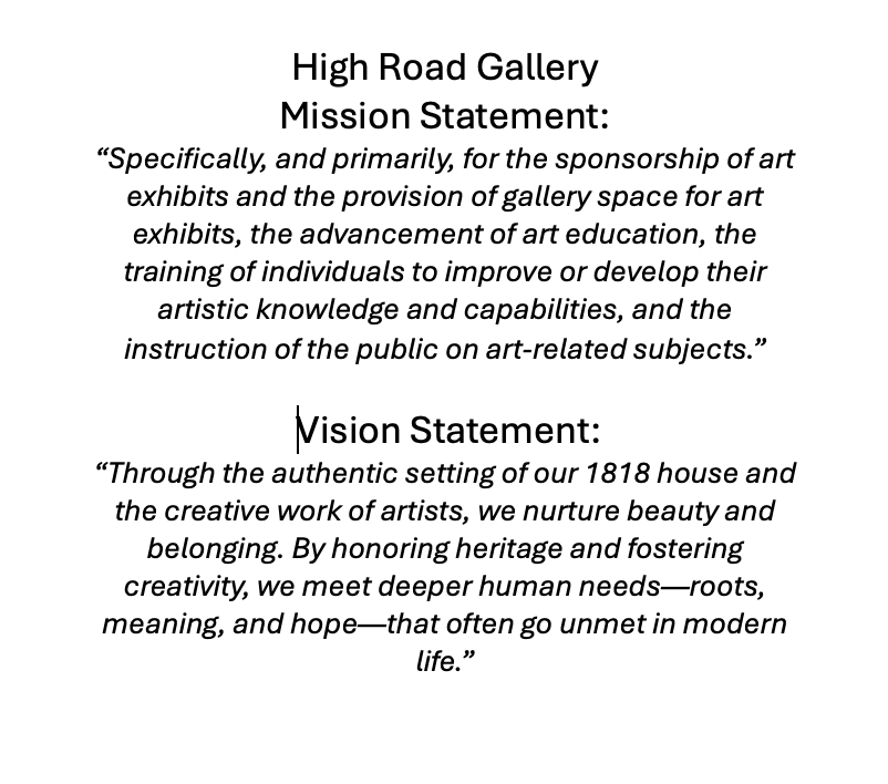 High Road Gallery is housed in one of Worthington’s oldest Federal-style buildings, built in 1818. By maintaining and sharing this space, we honor more than two centuries of local history.